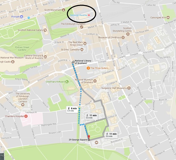 Walking between the School of Scottish Studies Archives and the National Library of Scotland on the Saturday morning should take around 10 minutes – 8 minutes’ walk apart according to this Google map (also shown below).